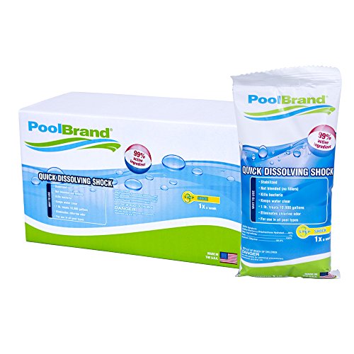 Pool Brand quick dissolving shock is a stabilized pool shock for use in all pool types. This product is not blended so there are no fillers. Kills bacteria & keeps your pool water clear. 1 lb treats 10 000 gallon. Eliminates chlorine odors. When used as directed this product is effective as a swimming pool water disinfecting agent (sanitizer). the dosage for your pool will change considerably depending upon those factors that burden the disinfection system. Some of the factors that will vary the required dosages are water temperature bather load exposure to debris thunder or rain storms & length of filtration cycle. Ensure all pool equipment is working properly. Adjust pH to between 7.2 & 7.6 add stabilizer to establish a minimum level of 30 40ppm. With pump running broadcast 4 oz of this product per 10 000 gallon directly into the water. Do not allow undissolved product to rest in contact with a bleach able pool surface. Regular use of a test kit is necessary to determine when it is necessary to add another dose of this product to maintain a residual of 1 3 ppm available chlorine in the pool water. An average daily dose of 2 3 osprey 10 000 gallon water. After use of this product it is recommended that a preventative algae treatment be added on a weekly basis. For Super chlorination you should broadcast one lb of this product per 10 000 gallon directly to the water. Follow above procedural advice. Never add water to product. Never add more than 1 lb of this product to 3 gallon of cool water. Do not mix with other products if pre dissolving. More Reviews On Amazon